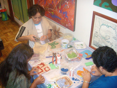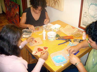 Este foi um Curso de Mosaico que ministrei voluntariamente, para algumas meninas da ONG AQUARELA, que fica no Jaguaré. Já estou com saudades delas. Na primeira foto, Clarice, Ana e Gabriela, comigo. Na segunda foto, as meninas com a Raquel, que foi quem as trouxe para as aulas, e quem teve a idéia deste curso específico. Minhas alunas fizeram descansos de panela, ficaram muito fofos, elas adoraram!