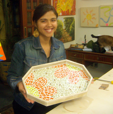 Esta é minha aluna Patrícia, com a bandeja que fez no seu Curso de Mosaico. Linda!!!