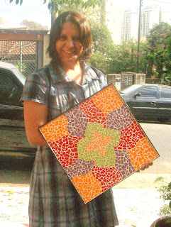 Esta é minha querida aluna Jaque, com sua mesinha feita no Curso de Mosaico. A Mandala foi ela mesma que desenhou, e o mosaico foi feito com cacos de azulejos, o que deu um colorido especial !!!