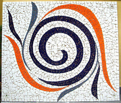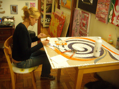 Este trabalho na verdade foi fixado em um teto, por isso os furos. Fiz o desenho conforme as preferências da Lu , e escolhemos as cores. Decidimos que seria mais interessante executar o projeto com cacos de azulejos.