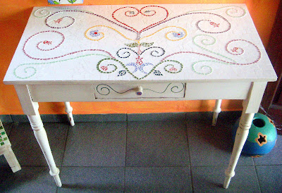 Esta mesa era de minha mãe, depois de minha irmã, e acabou aqui no atelier… Fiquei tempos sem mexer nela, pois queria fazer algo muito especial. Em um dia muito inspirador, comecei a fazer este mosaico, muito parecido com desenhos que faço em minhas telas. Resolvi fazer tudo bem colorido, harmonioso, e terminar com fundo branco para valorizar ainda mais os desenhos.