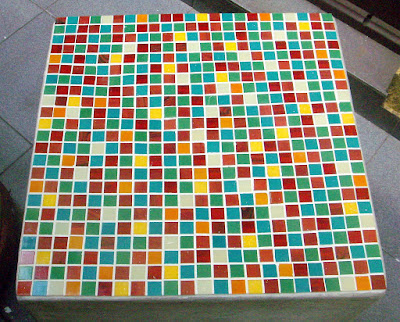 Para a base da “mesa”, ela optou pela aplicação de pastilhas de vidro inteiras. Não ficou lindo? Bem colorido , parecendo uma toalha!!!