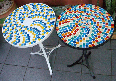 Fiz estas duas mesinhas em mosaico sob encomenda, para clientes diferentes. Eles escolheram o tamanho, as cores, o modelo, as bases.