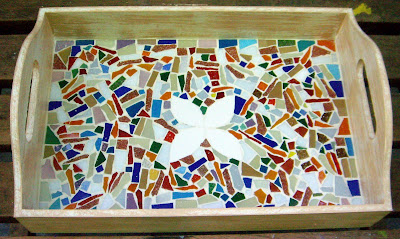 Mais uma bandeja prontinha!!! Esta feita com cacos de pastilhas de vidro, e a florzinha central com cacos de azulejos.