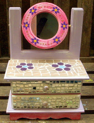 Mini Cômoda em mosaico. Reparem nas gavetinhas feitas com caquinhos de espelho, que LUXOOOOOOOOOOO!!!E o espelho redondo, coisa fofa!!!