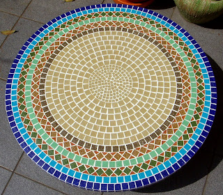 A segunda mesa tem 60 cm. de diâmetro e foi feita com cores mais neutras e pastilhas mais lisas. Como a mesa irá ficar em área externa, fiz a base do mosaico em cimento embutido no pé de ferro.