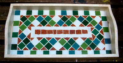 Estas são mais duas bandejas em mosaico que fiz sob encomenda. A primeira, bem pequenina, foi feita para um cliente que queria apenas um apoio para seu galheteiro. Usei cacos de pastilhas de vidro e finalizei pintando a madeira com a técnica de pátina envelhecida.