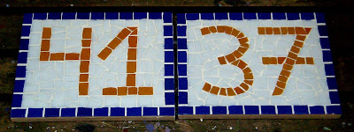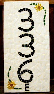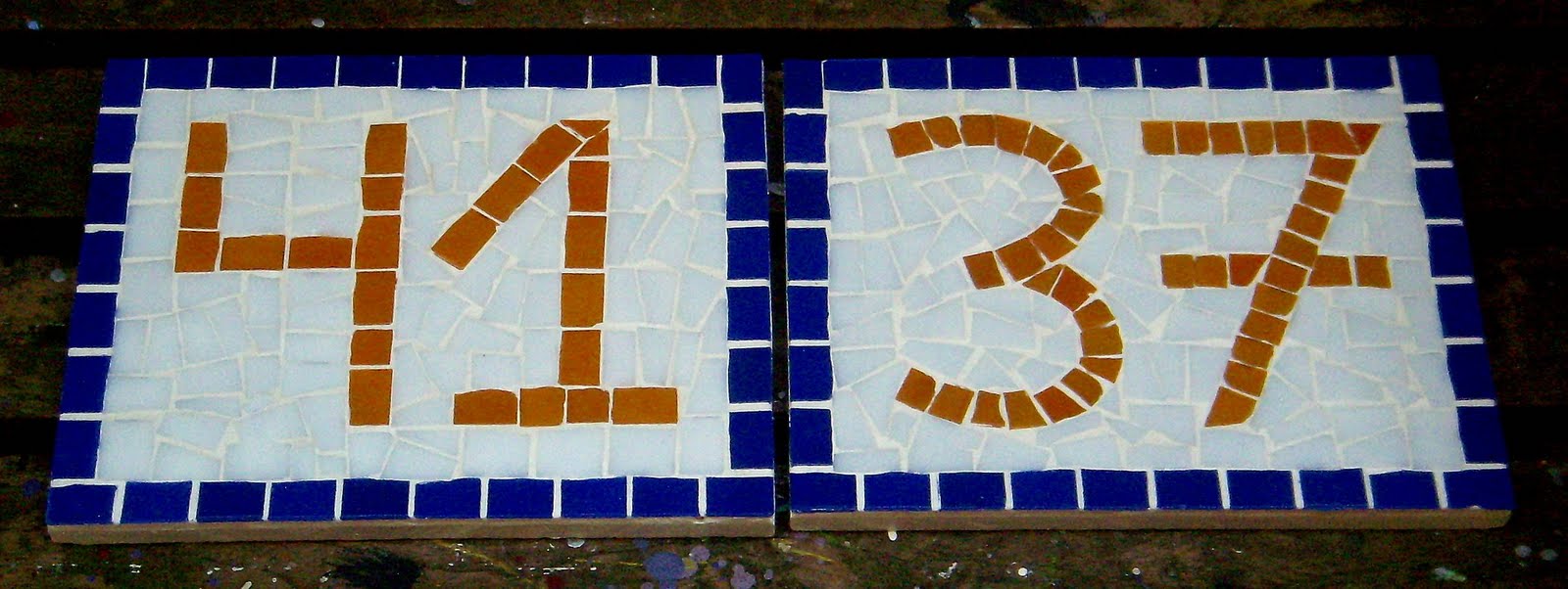 Base de fibrocimento, pois o número ficará em área externa.Med.: 30 x 30 cm., feito com cacos de pastilhas de vidro.