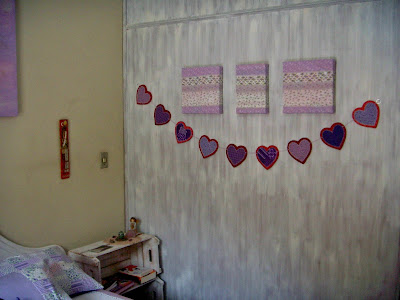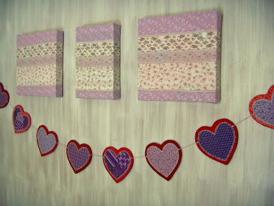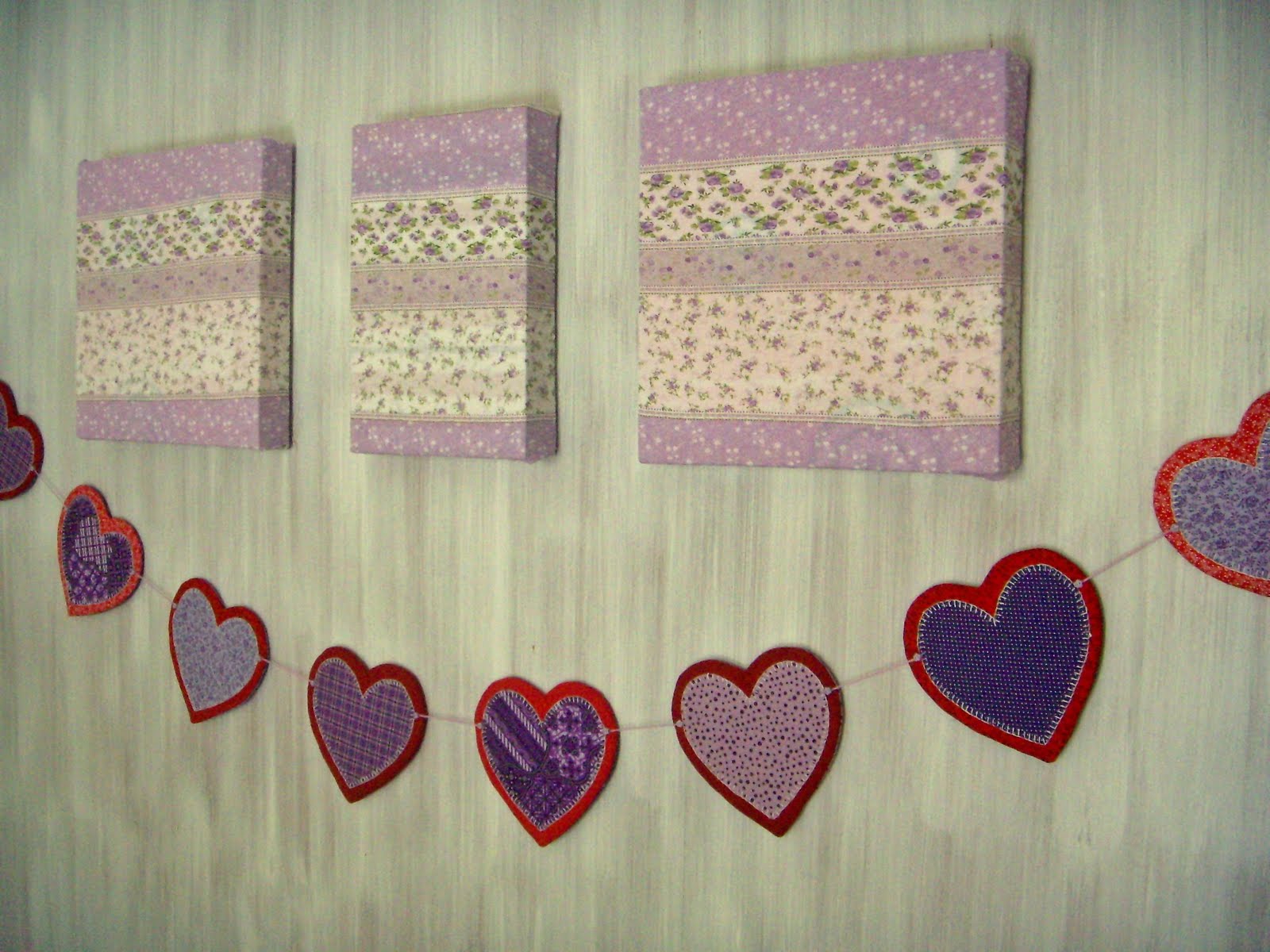 Revesti estas 3 telinhas com tecido que comprei lá na 25, e os meus amados corações foram feitos bem como eu pedi pela Soraia, do blog FELTROPORMIM. Pra quem não a conhece, clique aqui. Ela é uma pessoa maravilhosa!!!