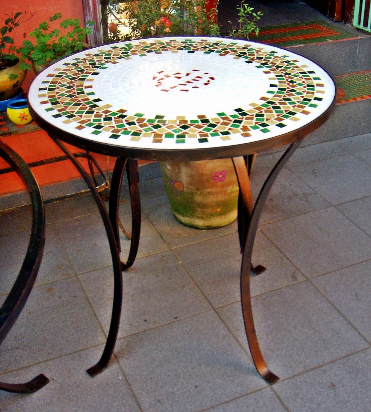 A mesa foi feita usando base de cimento para o mosaico, pois a mesma ficará em área externa. O tampo foi embutido na base de ferro, que pintei de ouro velho.