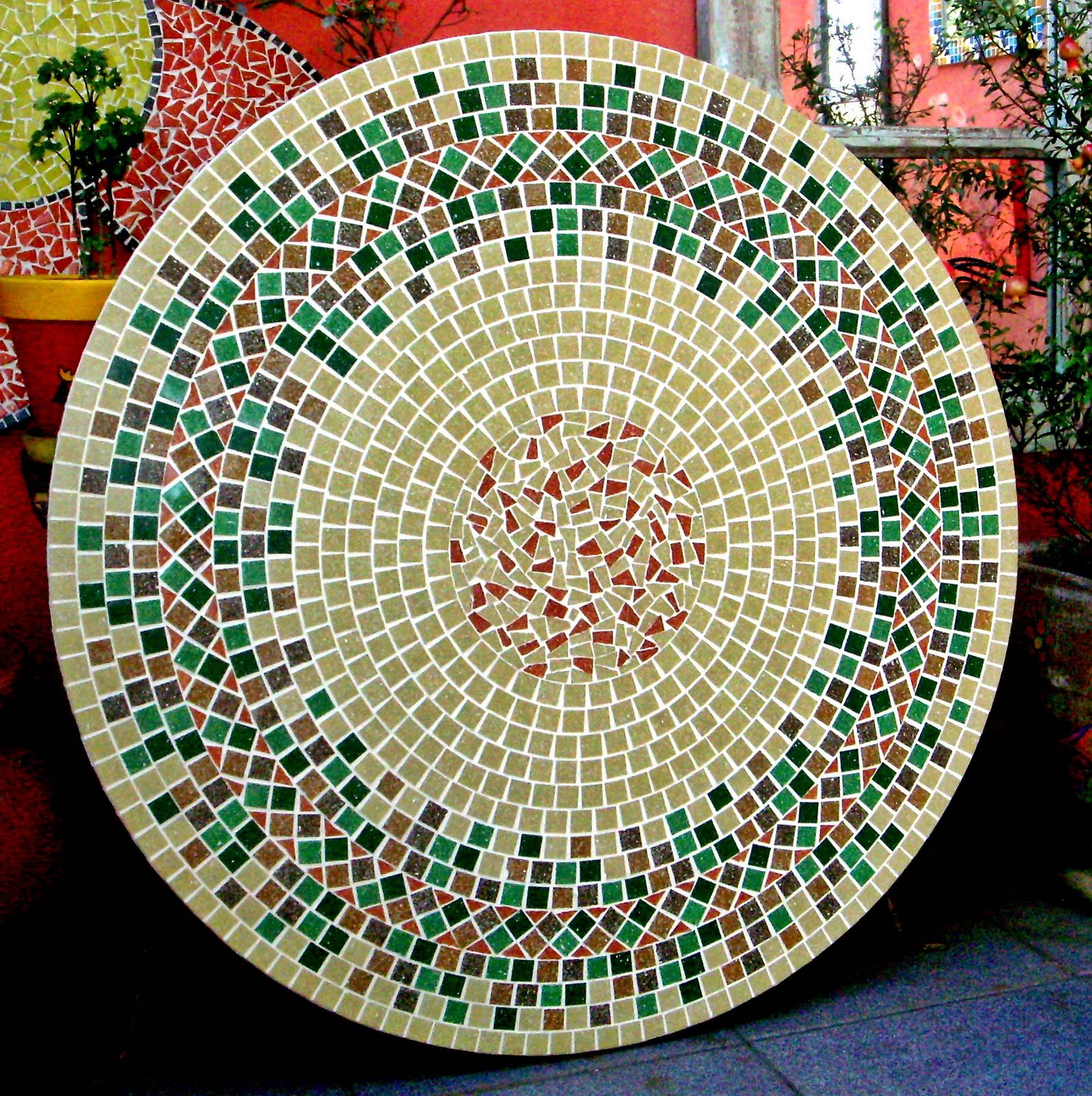Mesa com diâmetro de 85 cm., confeccionada com pastilhas de vidro pigmentadas, em tons de marrom, terracota e verde.