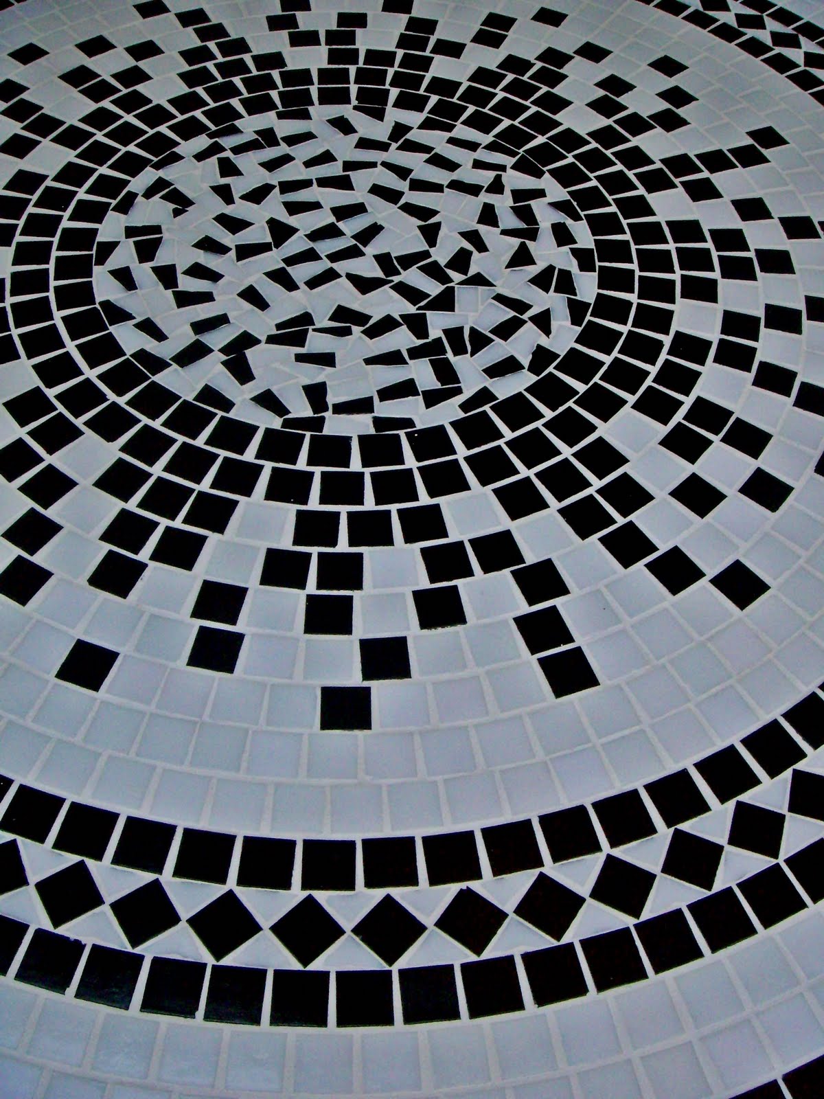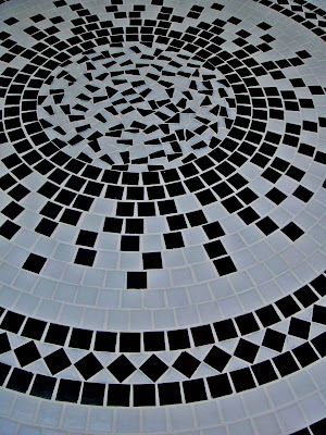 Mesa com diâmetro de 90 cm., confeccionada com pastilhas de vidro inteiras, pretas e brancas.
