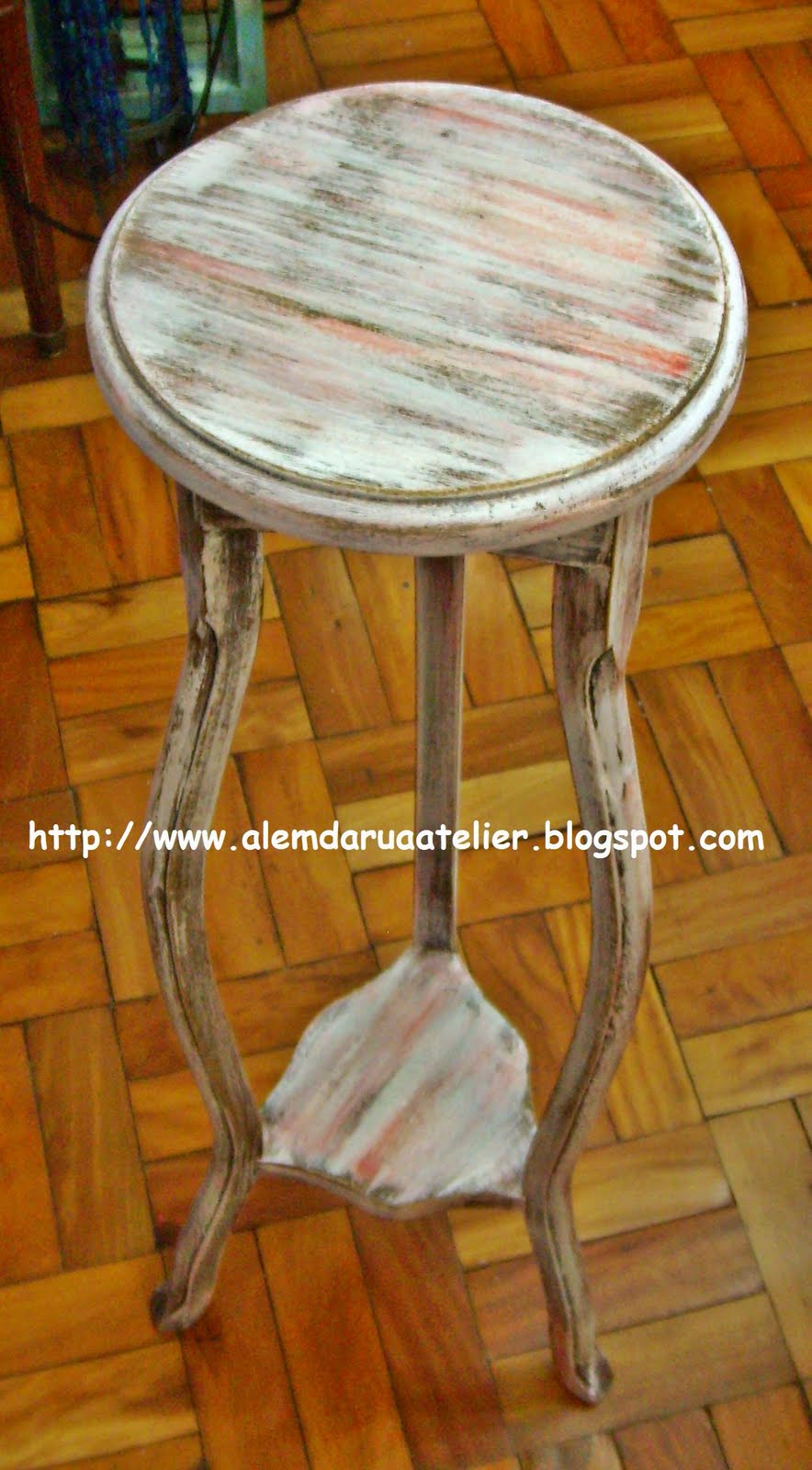 Minhas alunas fizeram pátina envelhecida tanto no banquinho como no suporte para vasinhos.