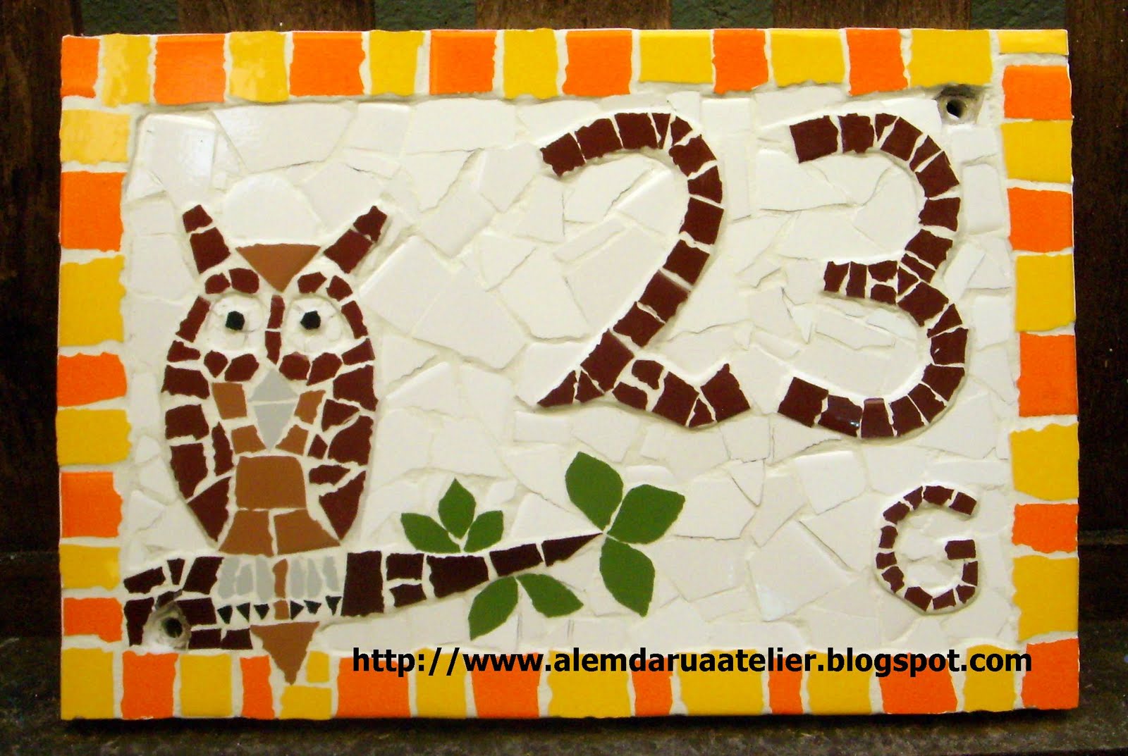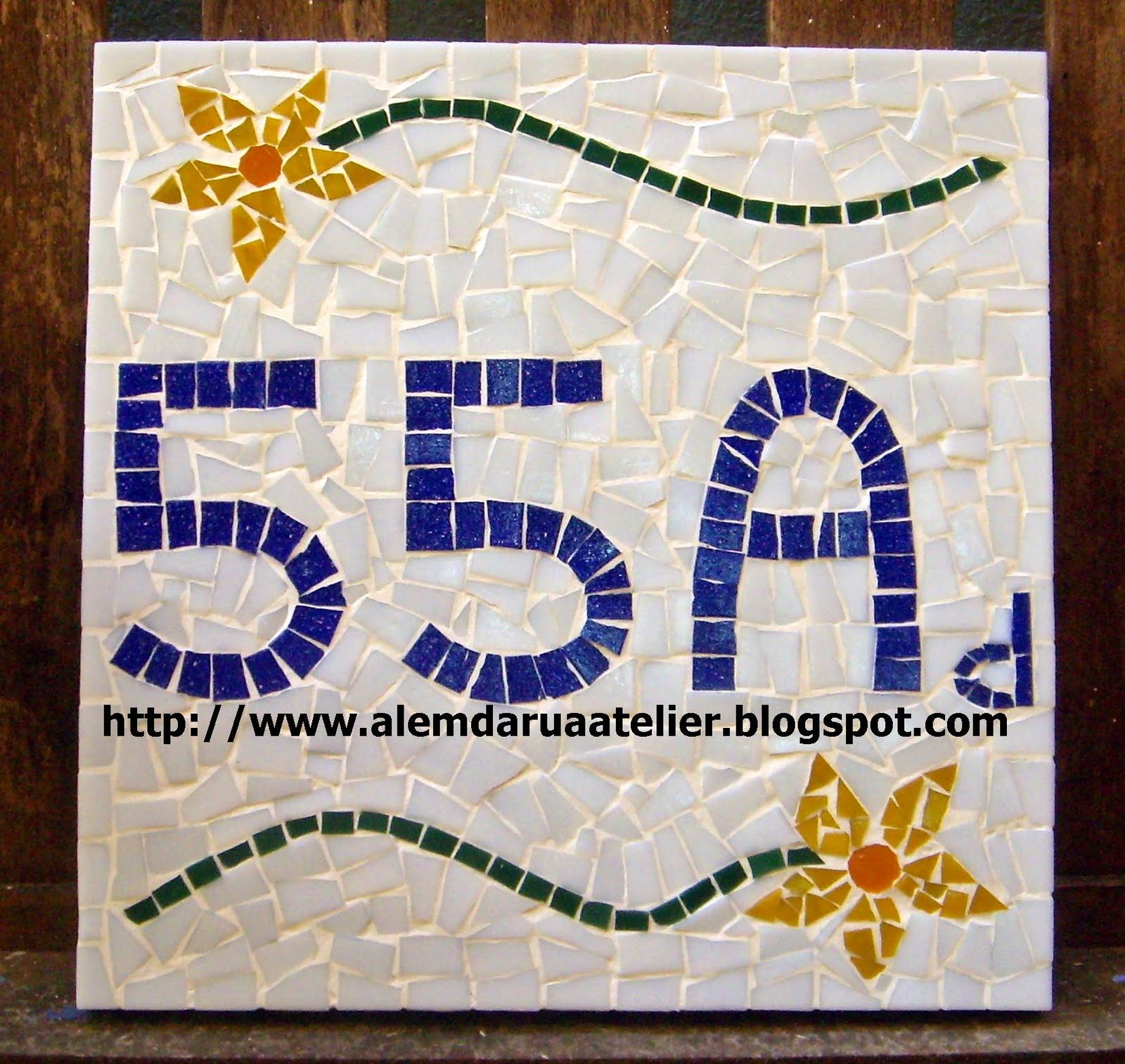 Outro número feito em placa de fibrocimento, com medida de 30 x 30 cm. e feito com cacos de pastilhas de vidro.