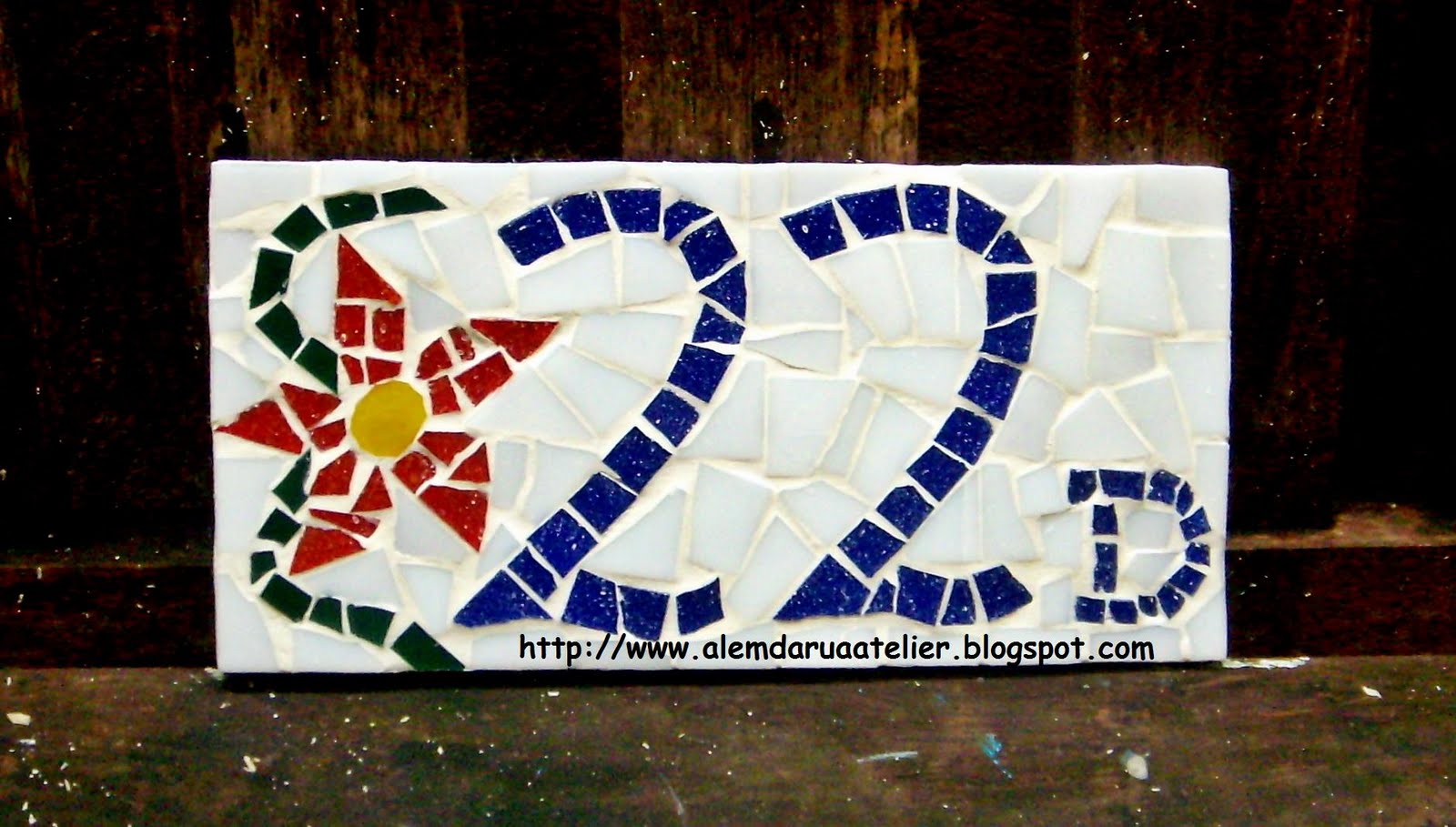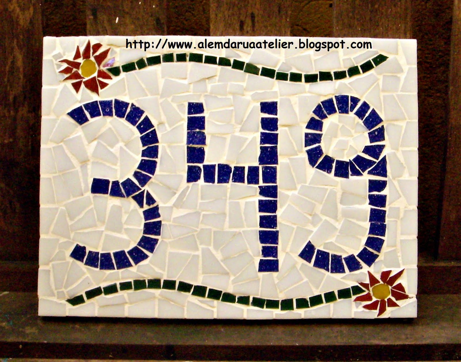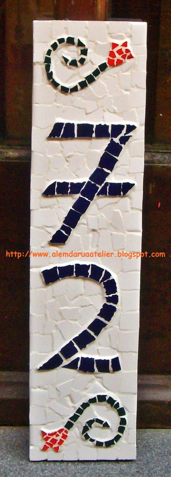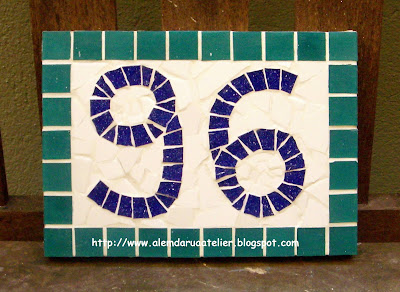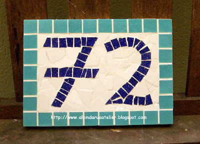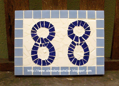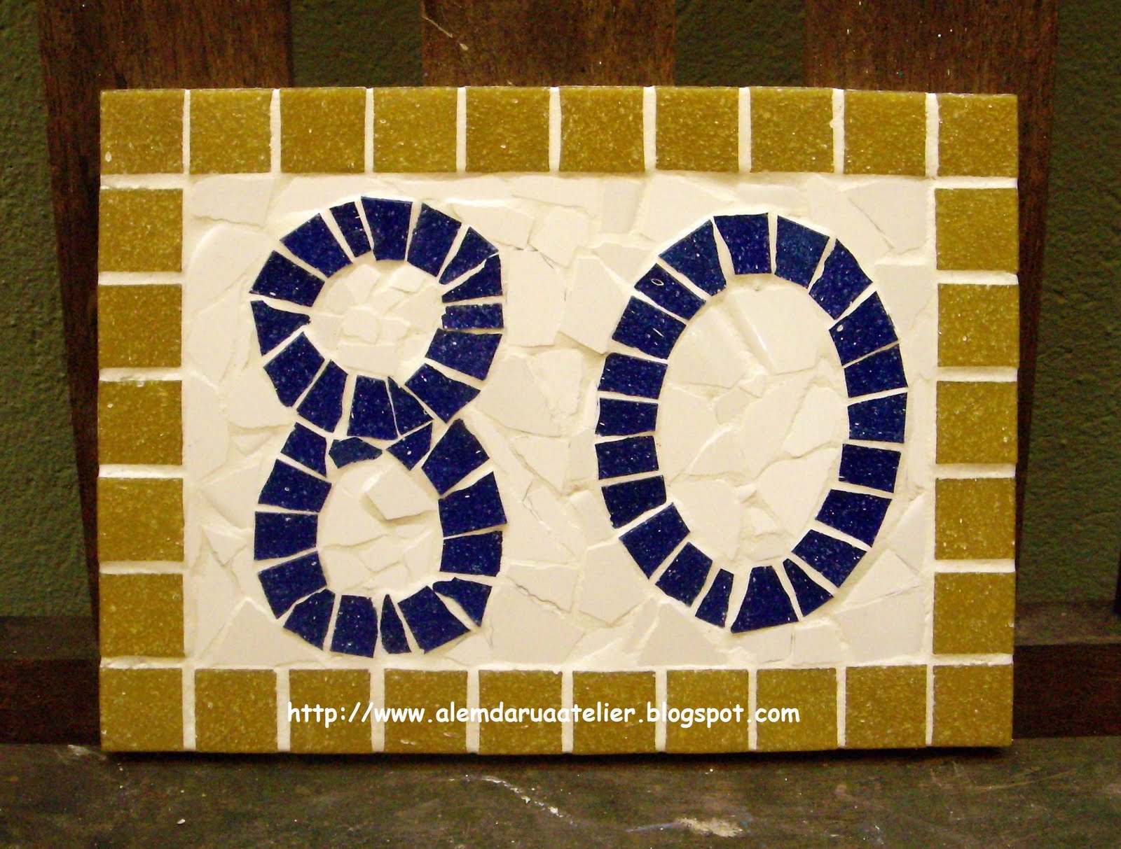 Faço números em diferentes tamanhos e com desenhos e materiais variados, como pastilhas de vidro e azulejos.
