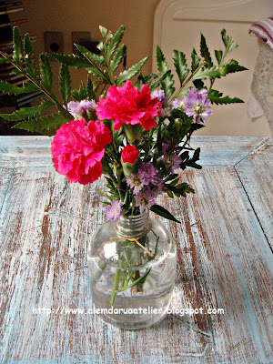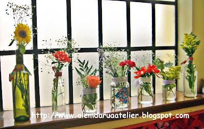 Eu tenho tbm vidros e garrafinhas já guardados prá uns projetos de reciclagem, amei tuas ideias, e as flores naturais são um charme à parte, tua casa ficou ainda mais linda e alegre.