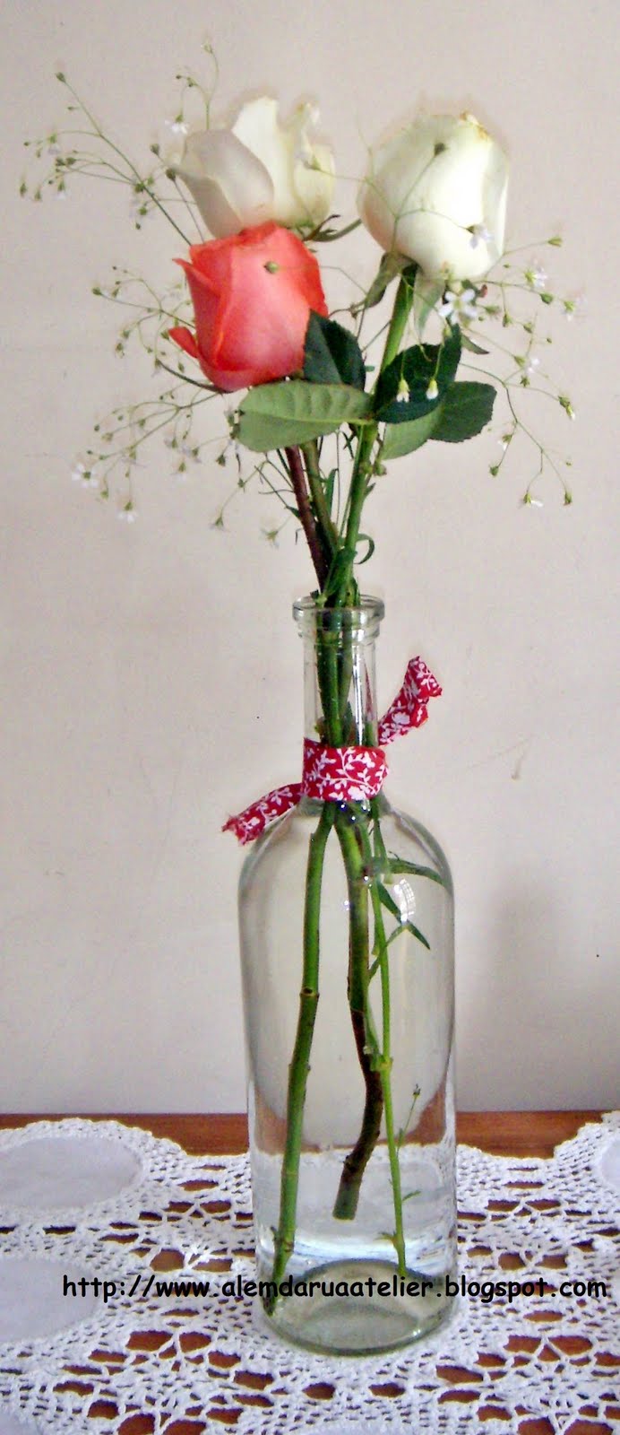 Com as flores, potes e garrafas de vidro, fiz vários arranjos .