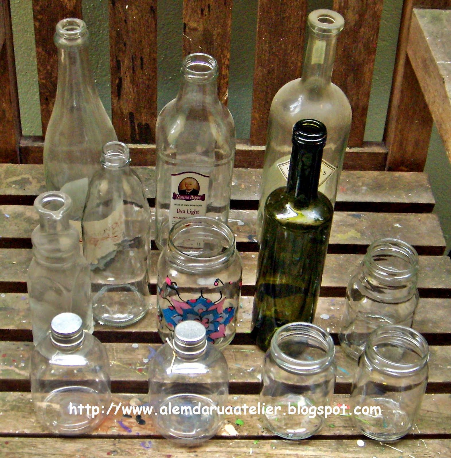 Aqui estão todos os potinhos de vidro e garrafas que fui juntando e que utilizei para embelezar minha vida.
