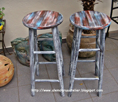 Nos pés, fiz pátina envelhecida branca, e nos assentos fiz uma pátina envelhecida colorida, em tons de branco, azul claro e vermelho queimado.
