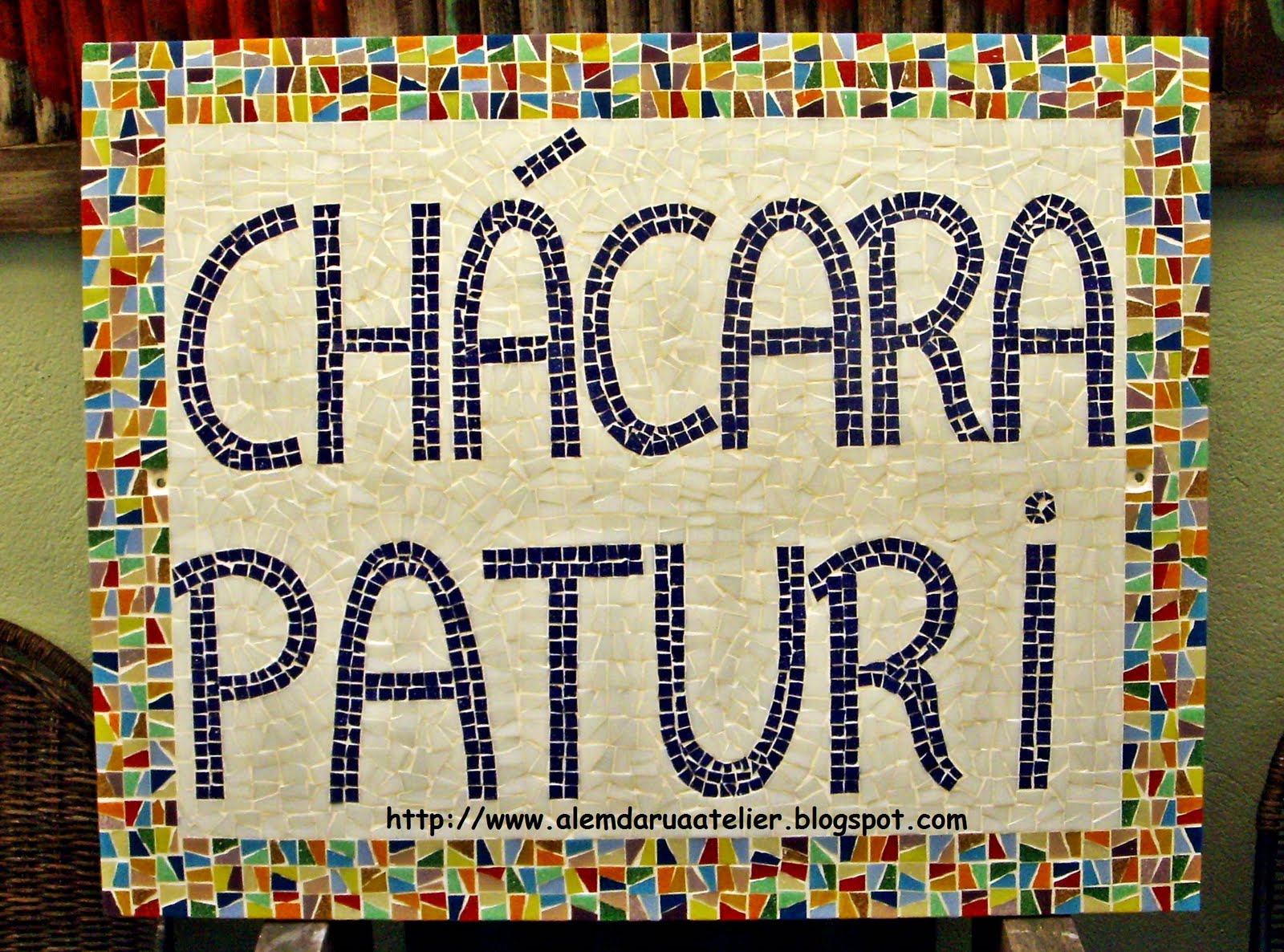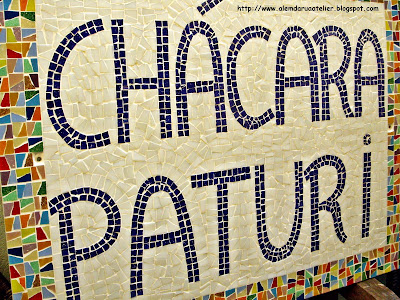 Esta placa de identificação mede 80 x 63 cm., e foi feita com cacos de pastilhas de vidro.