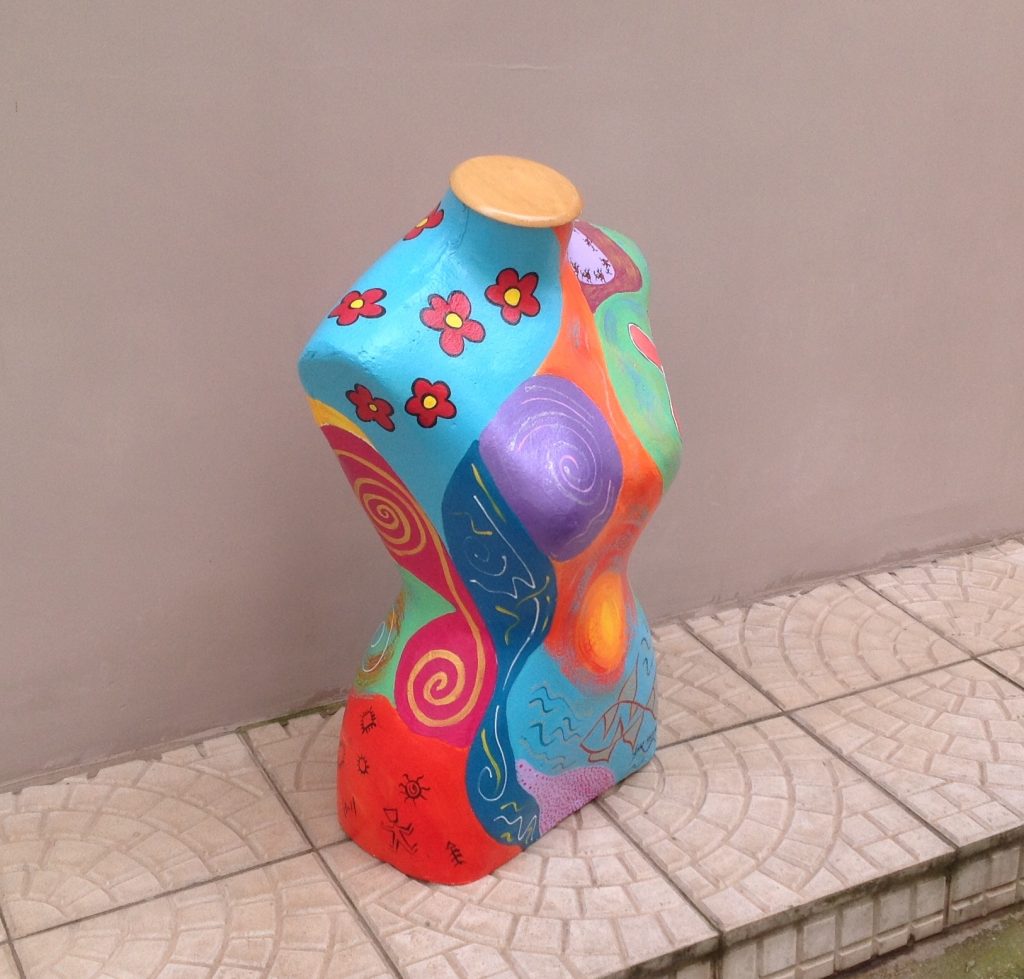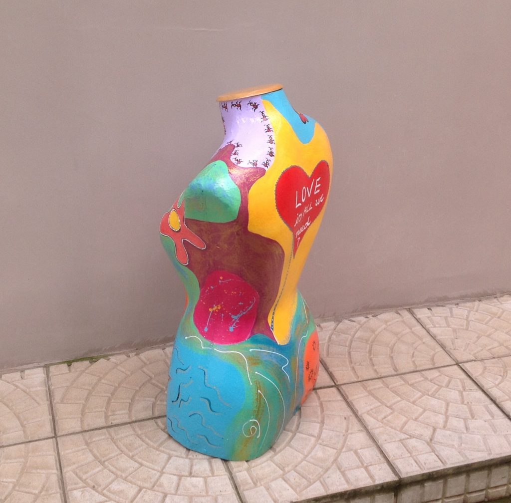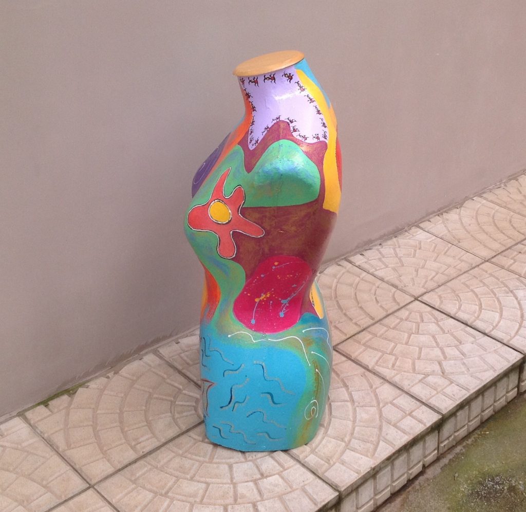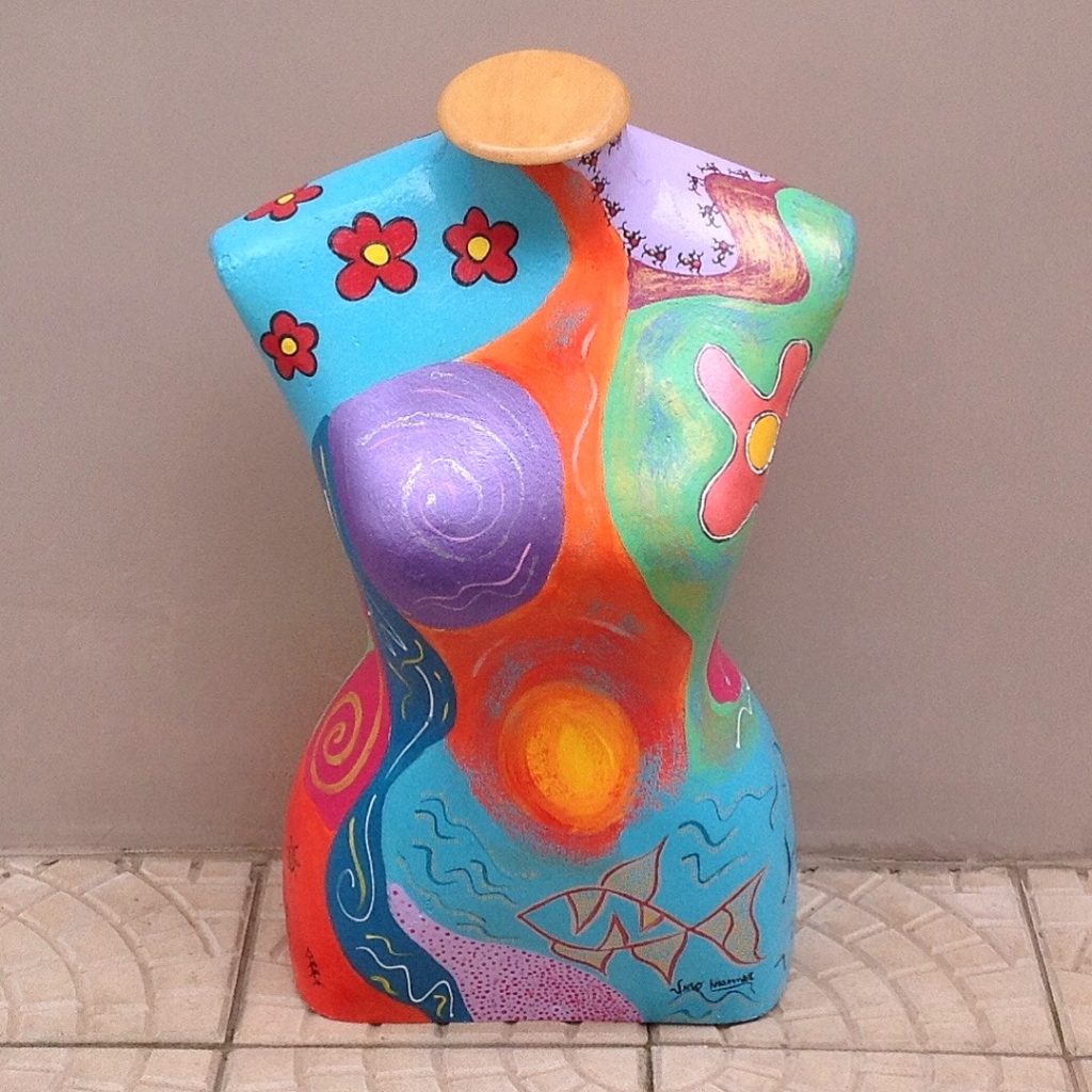 Para esta transformação, usei a tinta PVA (latex) como base, e depois fui colorindo cada pedacinho de meu manequim. Adoro fazer estas pinturas onde as cores se encontram e se entrelaçam! As formas surgem, e depois delas novas cores e desenhos! É mágico!