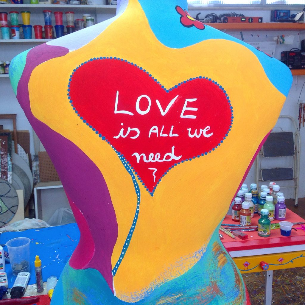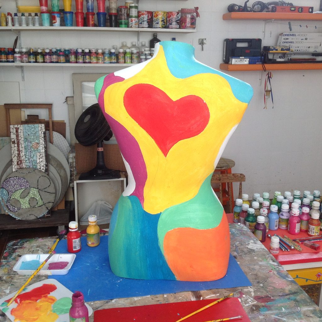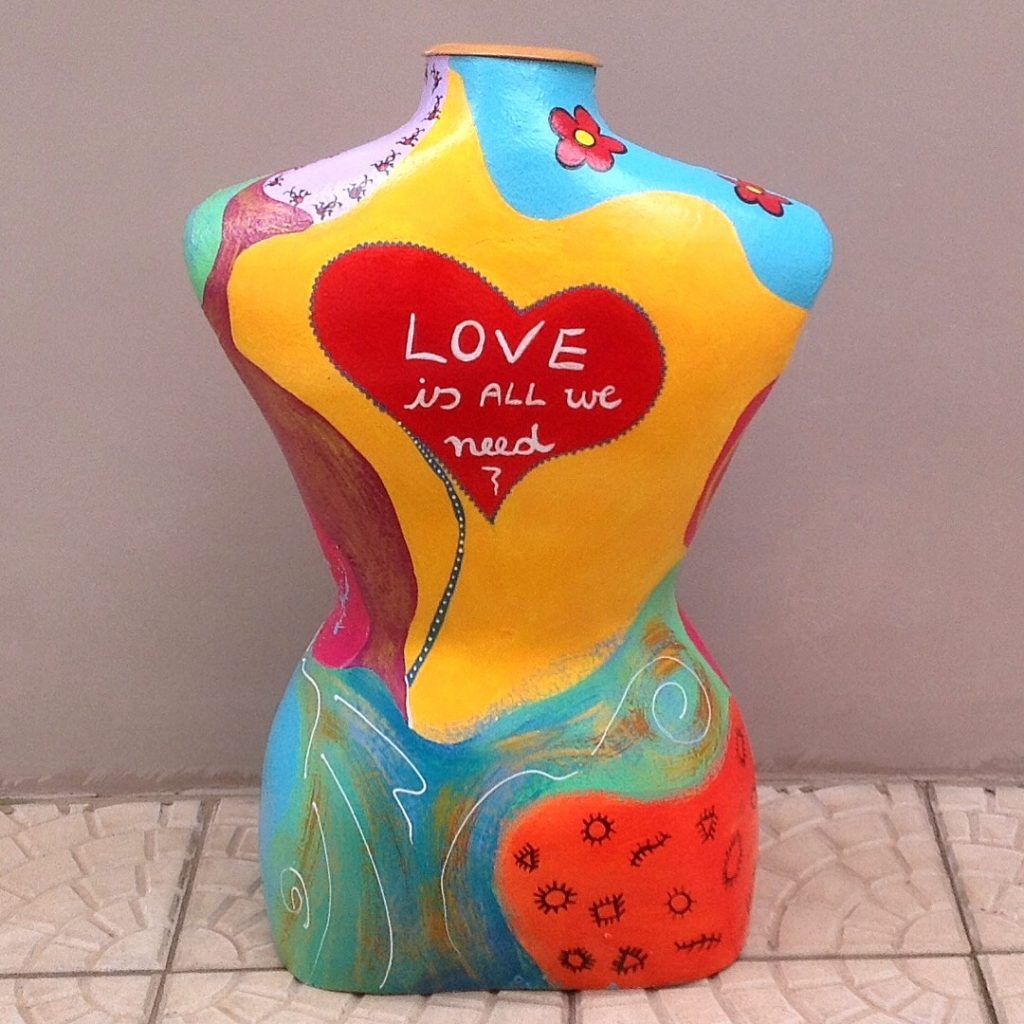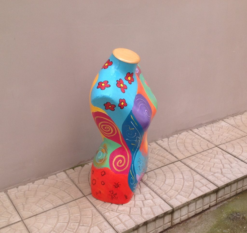Para esta transformação, usei a tinta PVA (latex) como base, e depois fui colorindo cada pedacinho de meu manequim. Adoro fazer estas pinturas onde as cores se encontram e se entrelaçam! As formas surgem, e depois delas novas cores e desenhos! É mágico!